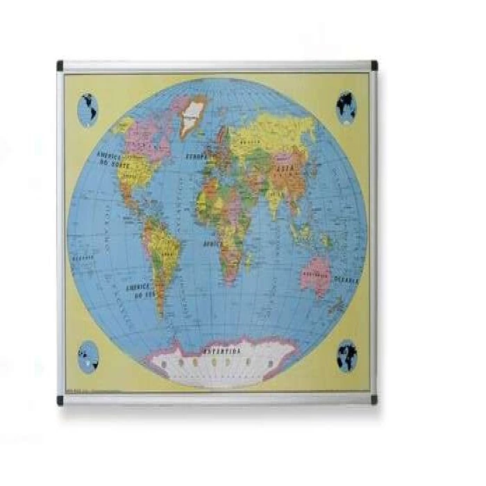 Mapa Mundi, fabricado em chapa de fibra resinada, com acabamento acetinado e moldura metalica arredondada. Acompanha acessórios para fixação. Fabricado por Board Net LTDA. Conteúdo: Quadro mapa MundiTamanho: 90x120cmMapa geopoliticoFabricante: Board Net LTDA