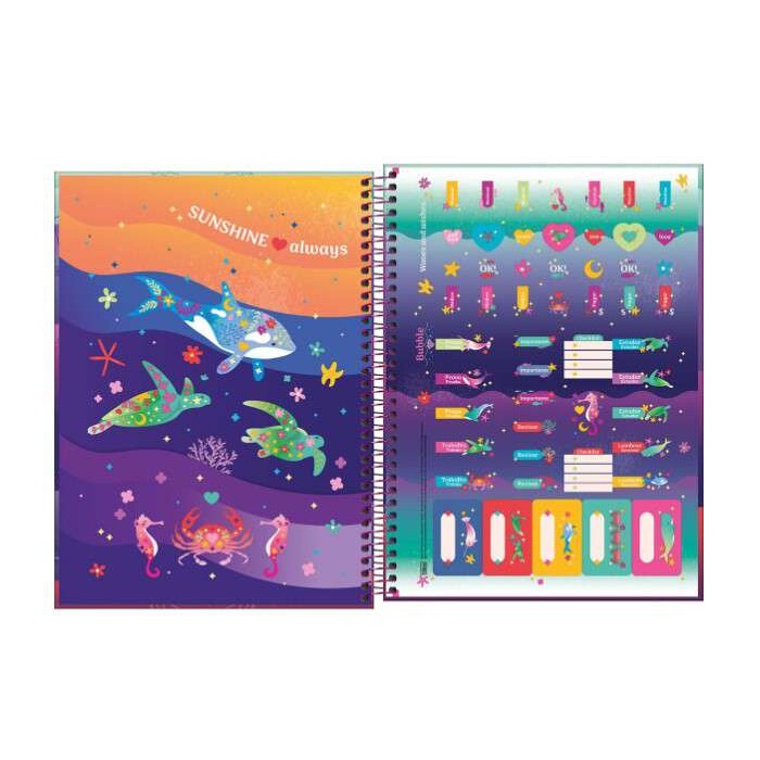 Use este modelo, com capa dura com parte interna decorada, bolsa de papel decorada para guardar trabalhos, adesivos funcionais, folhas pautadas e espiral colorido, para anotar as aulas, fazer resumos, listar tarefas e organizar as ideias de forma prática e eficiente.