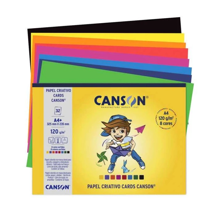 O Bloco Criativo Cards Canson contém 32 folhas de papel colorido em 8 cores sortidas. Papel de 120g/m² ideal para artesanato ou atividades escolares de recorte e colagem, dobradura, origami, esculturas e desenhos.Os papéis coloridos Criativo Cards da Canson possuem tons fortes e vibrantes e são coloridos na massa, por isso, não deixam vincos brancos e são mais resistentes ao desbotamento.Pode ser usado para desenho com lápis grafite, canetas porosas, canetas hidrográficas.Características:Formato A4+ (325mm235mm)Contém 32 Folhas (8 cores sortidas)Gramatura: 120g/m²Composição: 100% celulose de madeira