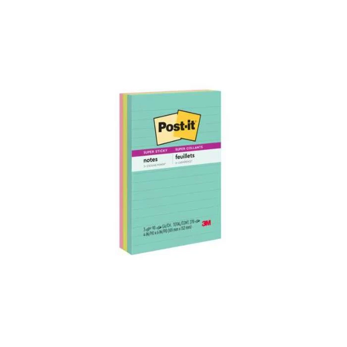 Bloco Post It com 90 folhas, medindo 101mm x 152mm, fabricado por 3M do Brasil, nas cores Verde, Rosa e amarelo