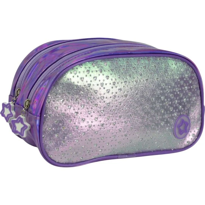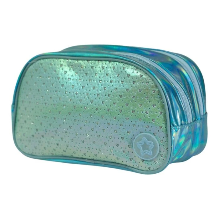 Estojo escolar; Estojo feminino; Estojo corações; Estojo holográfico; Estojo duplo; Estojo escolar feminino; Compartimentos com zíper; Material resistente; Organização escolar; Acessórios escolares; Uso diário; Estojo prático; Escolar juvenil; Estojo compacto