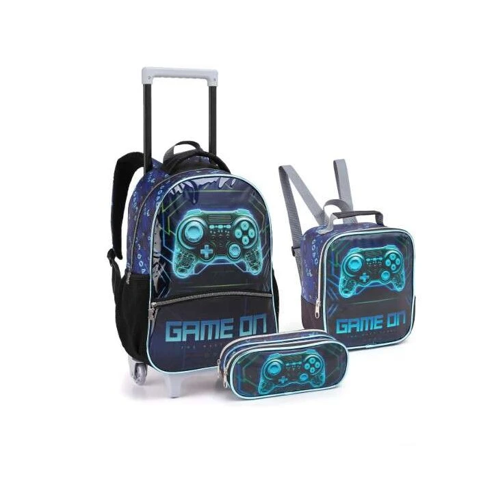 O Kit Mochila cem Roda Seanite Game (Kit com 3 peças) é um conjunto de mochila escolar que provavelmente vem com alguns acessórios adicionais, sendo uma opção prática e atrativa para crianças, especialmente por ser voltado para um público jovem com o tema "Game que é bastante popular entre as crianças.