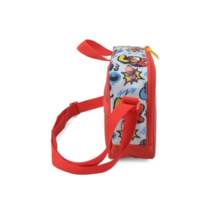 Lancheira infantil, composta de 70% poliéster e 30% PVC, possui um compartimento principal, alça de mão, alça lateral e alça para usar no carrinho.