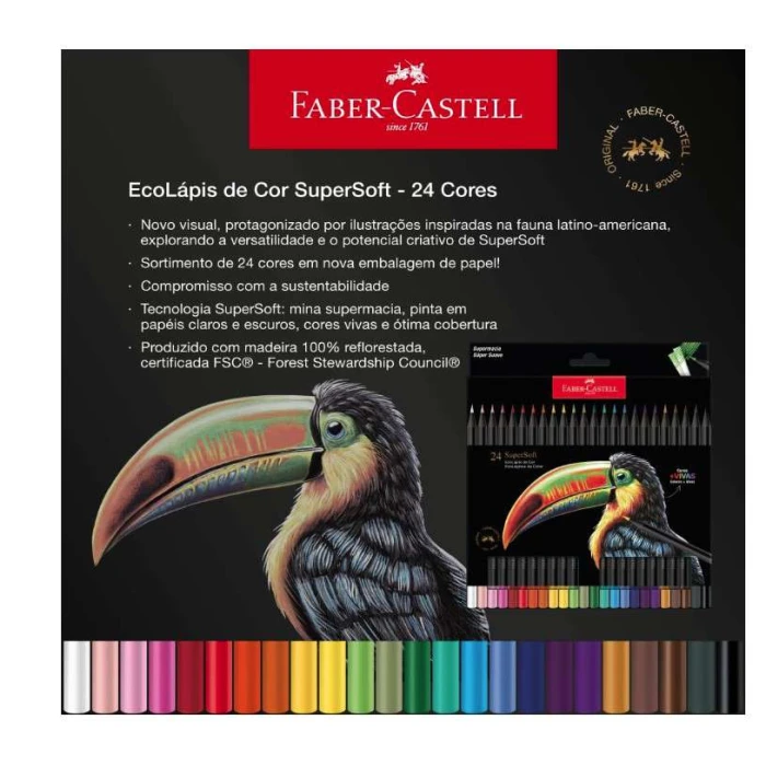 Conteúdo: Lápis de Cor Ecolápis 100 cores Faber-CastellReferência do Fornecedor: 1207100SOFTContém: 1 UnidadeMedidas: 22,5x21x6 cmFabricado: Faber-CastellO Ecolápis de Cor Faber-Castell SuperSoft possui a exclusiva mina supermacia, que garante o máximo de conforto ao pintar. O estojo contém 50 cores mais vivas com excelente cobertura, sobre papéis claros e escuros. Além disso, a embalagem é reutilizável e 100% reciclável. Produzido com madeira 100% reflorestada e certificada pelo FSC: respeito ao meio ambiente. ATENÇÃO! Não recomendável para crianças de até 3 (três) anos, por conter parte(s) pequena(s) que pode(m) ser engolida(s) ou aspirada(s). Produto atóxico e não perecível. Características: Cores incríveis e mais vibrantes, Mina supermacia com maior deposição de pigmento, Embalagem reutilizável e 100% reciclável, Excelente cobertura sobre papéis claros e escuros, Madeira 100% proveniente de manejo florestal sustentável e certificado pelo FSC: respeito ao meio ambiente, Produto atóxico e não perecível.