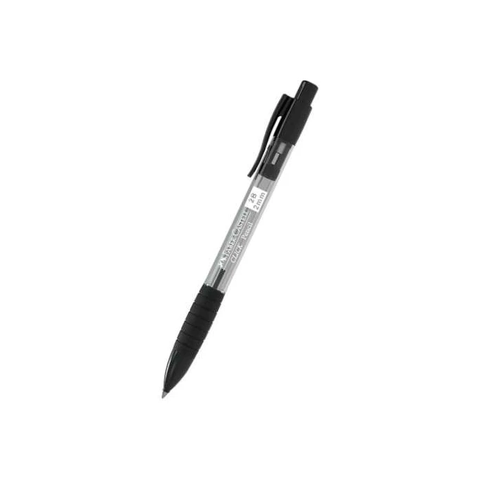 A Lapiseira Faber-Castell Click Pencil 2.0mm Preta é uma ferramenta de escrita e desenho ergonômica, com grip emborrachado para conforto, corpo preto, usa grafite grosso de 2.0mm, ideal para traços firmes e sombreamento, e possui um apontador integrado na ponta para manter a mina afiada, vindo pronta para uso com um tubo de grafite incluso, sendo perfeita para estudantes e artistas.