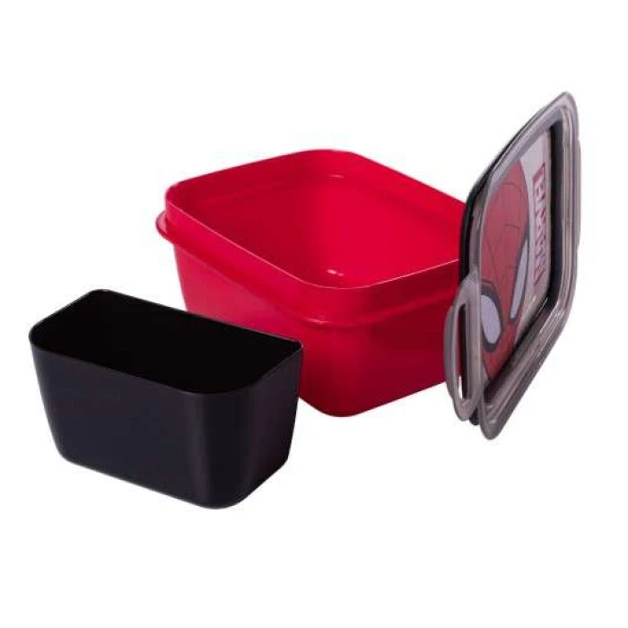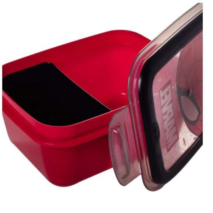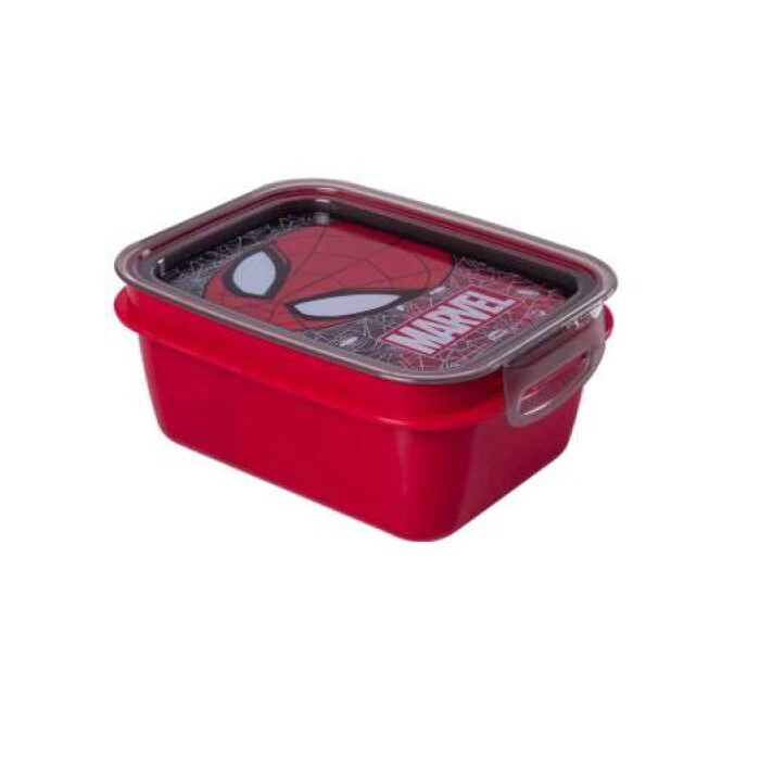 Marmita Plasútil Homem Aranha 850ml com tampa vedante e trava lateral, prática, segura e ideal para armazenar refeições e lanches infantis.