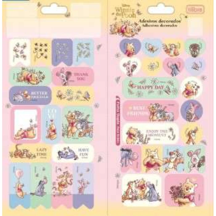 O Adesivo Decorado Duplo Pooh Tilibra é um conjunto de adesivos com ilustrações do ursinho Pooh e seus amigos, ideal para personalizar objetos, cadernos, agendas e outros itens de papelaria. Com design colorido e divertido, oferece duas folhas de adesivos, sendo uma com adesivos menores e outra com adesivos maiores.