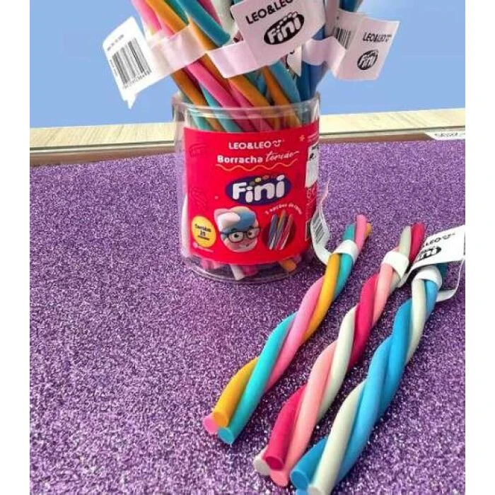 Borracha torcida fini pote c/20 unidades disponível em 3 combinações de cores azul+branco rosa+branco e azul+amarelo+rosa com formato de torção divertido e criativo além de apagar bem é supermacia colecionável e ideal para escola e escritório atóxica e de alta qualidade transforma o simples ato de apagar em uma experiência alegre e descontraída.