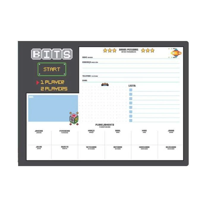 O Caderno de Desenho Bits Jandaia traz o tema oficial Bits, uma coleção inspirada no universo digital e tecnológico, com capas que exploram gráficos pixelados, padrões geométricos e referências visuais à linguagem dos bits, transmitindo modernidade, criatividade e um estilo jovem e conectado. Ideal para quem gosta de expressar ideias e criar com um visual atual (caderno grande).