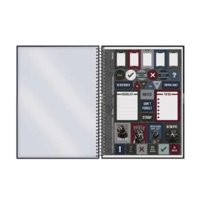 O caderno espiral universitário Power Dog possui capa dura com laminação fosca, verniz reserva, parte interna decorada, bolsa plástica para guardar trabalhos e anotações, folha com adesivos funcionais, folhas com pauta básica e espiral preto. Ideal para o dia a dia na escola ou na faculdade.