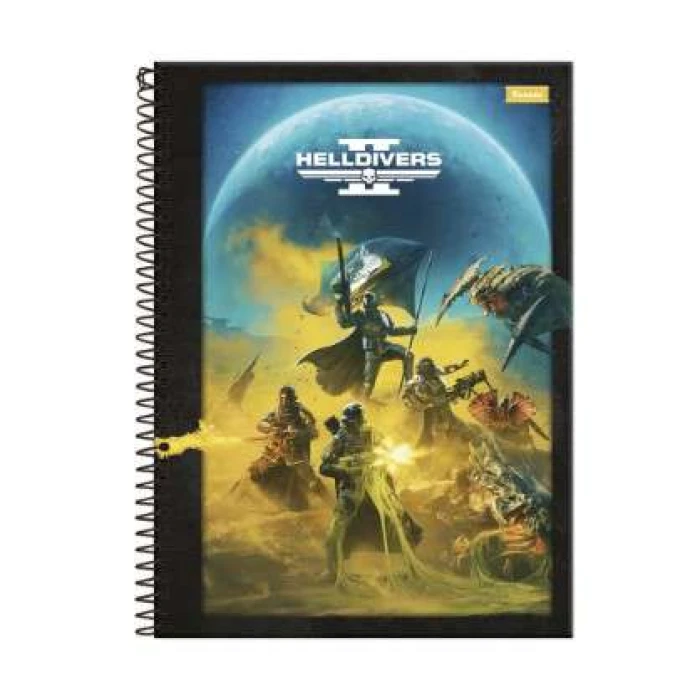 - Capa Dura Decorada: Protege as páginas e possui um design atrativo com ilustrações Helldivers 2.
