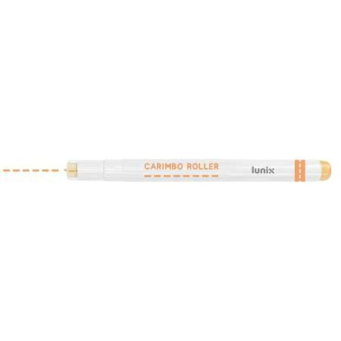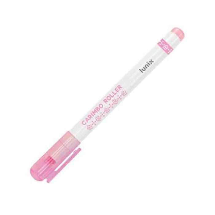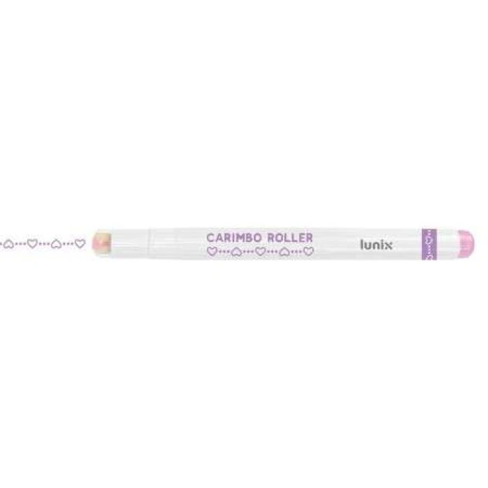 O Carimbo Roller Lunix tem formato de caneta, com tinta à base de água, nas opções de estampas de corações lilás, flores rosas, tracejados laranjas e ondas azuis.
