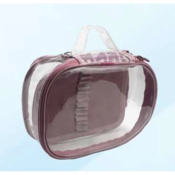 Compartimentos: 1 compartimento em zíper, em material cristal, com sistema de discos para adicionar divisórias;