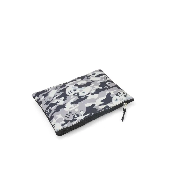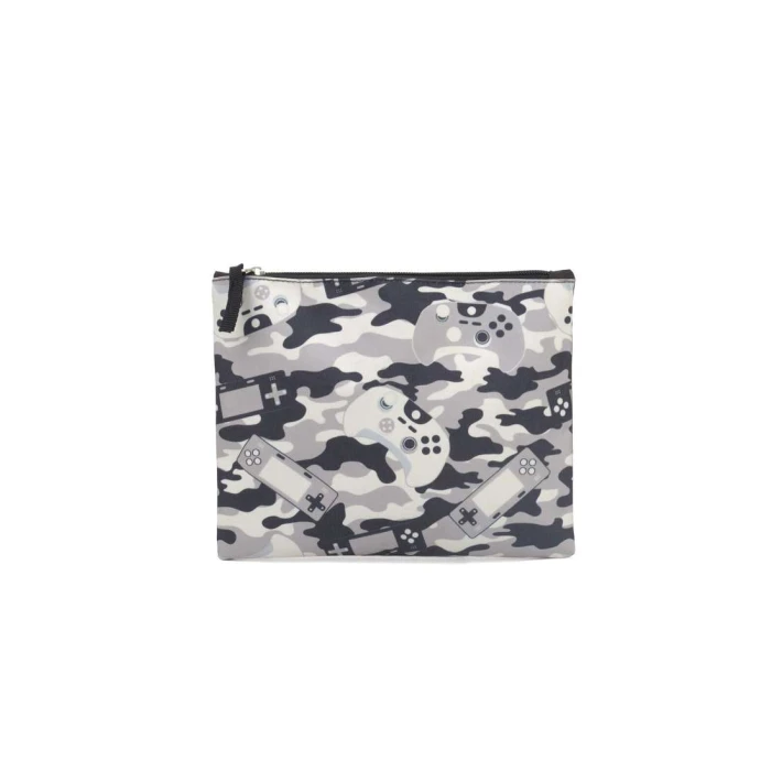 Estojo envelope com fundo preto e estampa de game, contém um zíper, amplo espaço.