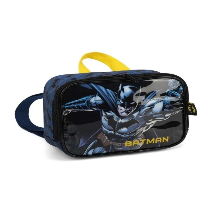 Lancheira infantil Batman, composta de poliéster e PVC, possui fechamento em zíper, logo em silk e alças ajustáveis.