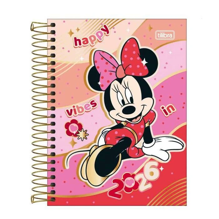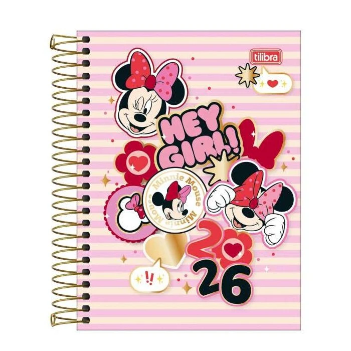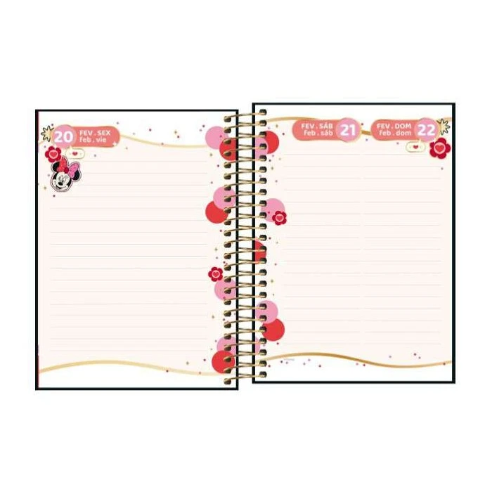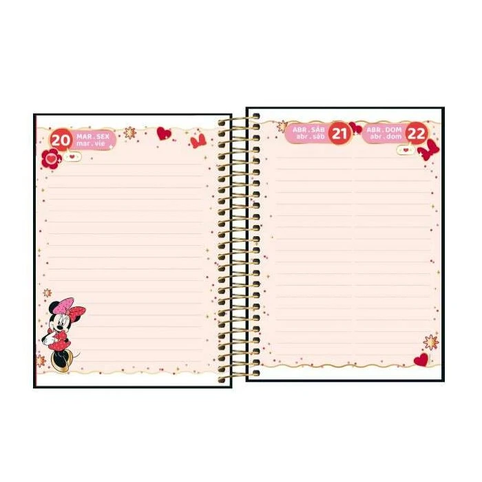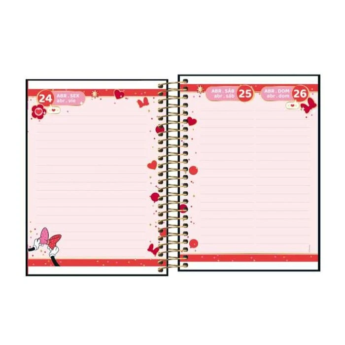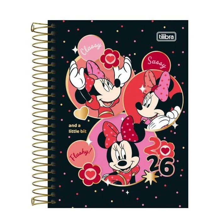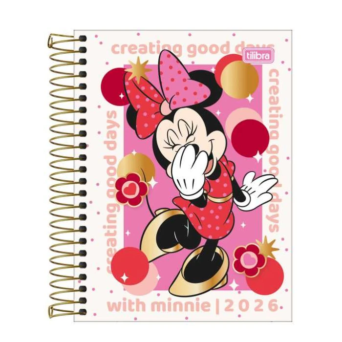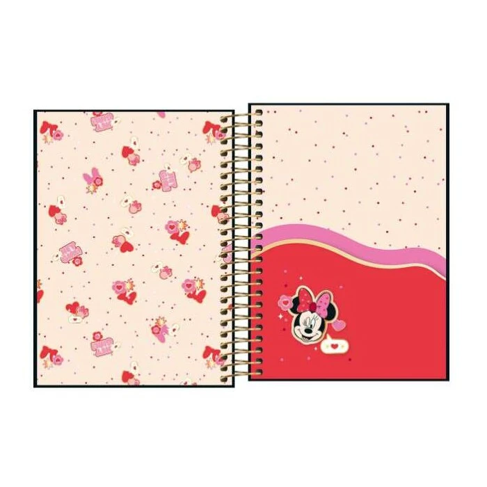 A Agenda Espiral Diária 11,7 x 16,4 cm Minnie 2025 com visão de 1 dia por página, exceto sábado e domingo. Possui capa dura com material especial brilhante, acabamento em espiral dourado e bolsa de papel para guardar trabalhos e anotações. Ideal para a organização do dia a dia.