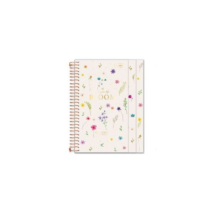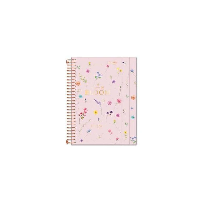Guarda decorada, bolsa pocket, cartela de adesivos, editorial, divisórias de matérias, espiral e miolo com micro serrilhas.