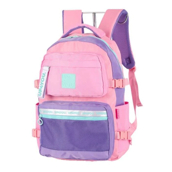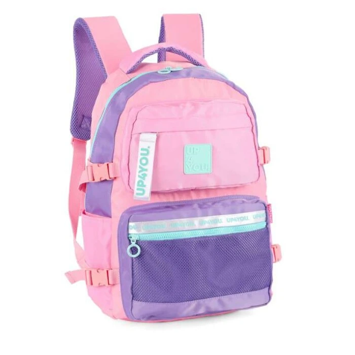 A Mochila sem Roda Luxcel Up4You Bolsos MJ49081UP-RX é feita com material resistente e tem um design moderno, com a cor predominante em rosa. A mochila possui vários bolsos para organização, ideal para o uso diário em ambientes como escola, faculdade ou trabalho. É uma mochila compacta, leve e confortável, com alças ajustáveis e acolchoadas.