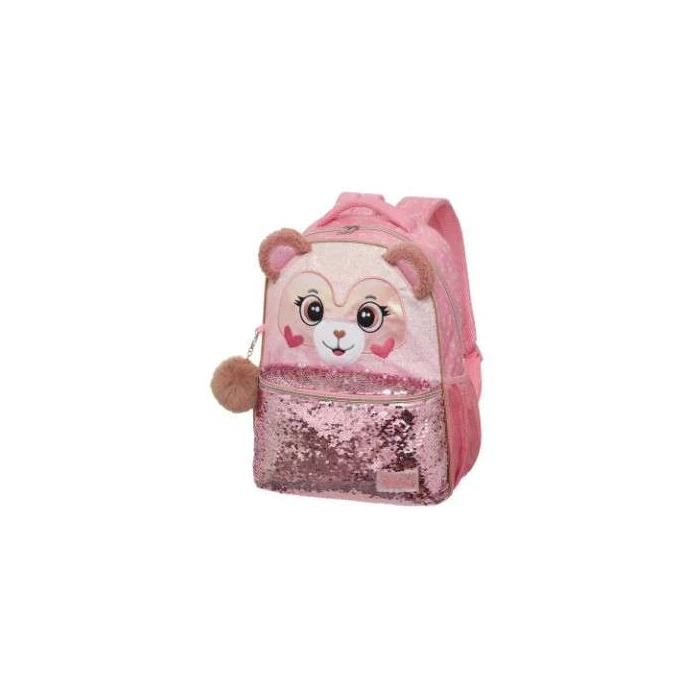 A Mochila Pack Me Teddy Bear da Pacific é uma mochila infantil fofa e funcional, com design de ursinho, orelhinhas 3D, materiais resistentes como cetim e PU com glitter, rosto bordado em veludo, e detalhes em lantejoulas, ideal para a escola, oferecendo compartimentos amplos e conforto com alças acolchoadas, podendo vir em kits com lancheira térmica.