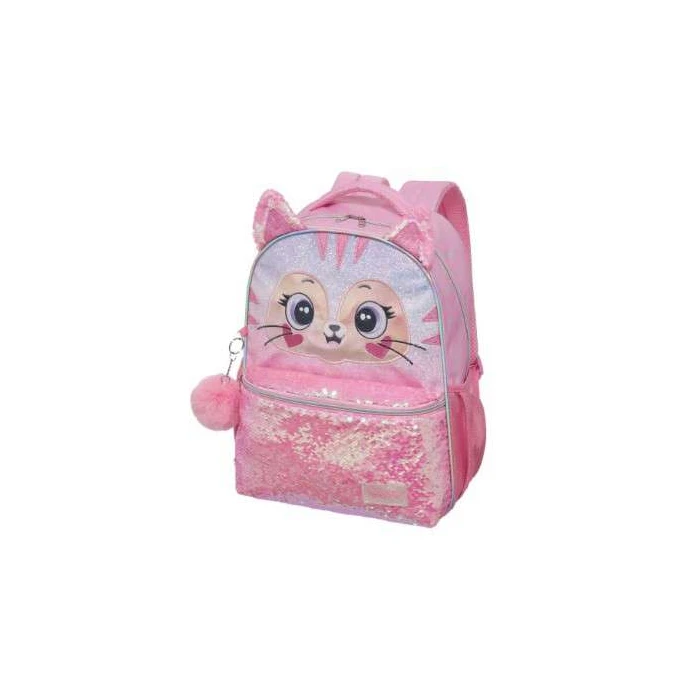 A Mochila Pack Me Kitten da Pacific é uma linha escolar infantil com design fofo de gatinho, orelhinhas 3D, detalhes em lantejoulas (reversíveis ou não) e pompom, feita em poliéster resistente, com compartimentos amplos, bolsos laterais para garrafas, alças acolchoadas, disponível em modelos de costas ou rodinhas, ideal para meninas que amam estilo e praticidade no dia a dia escolar.