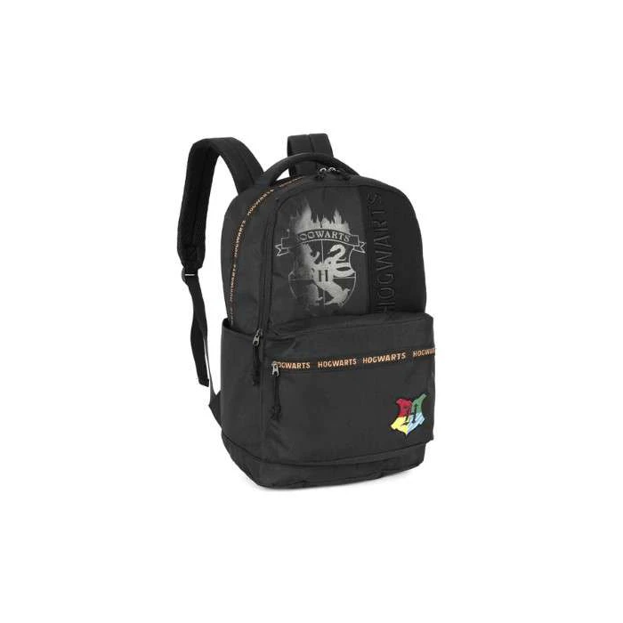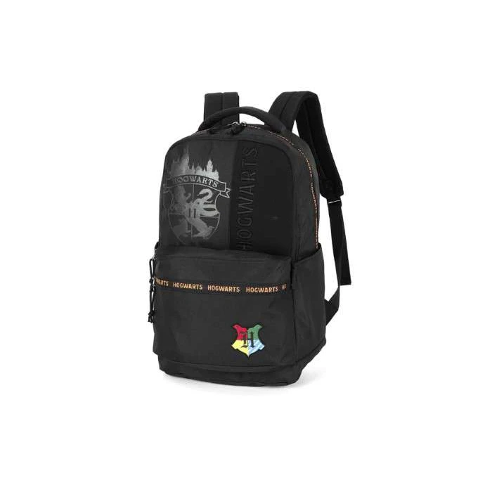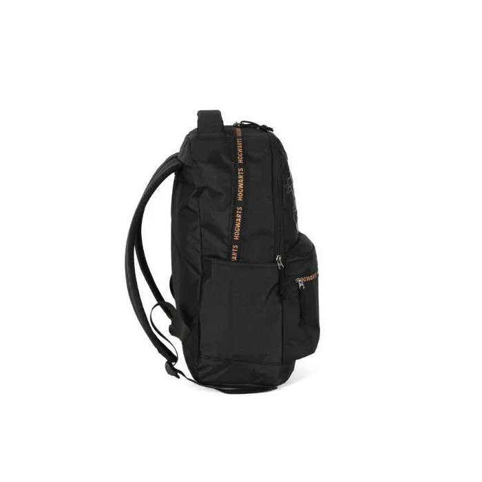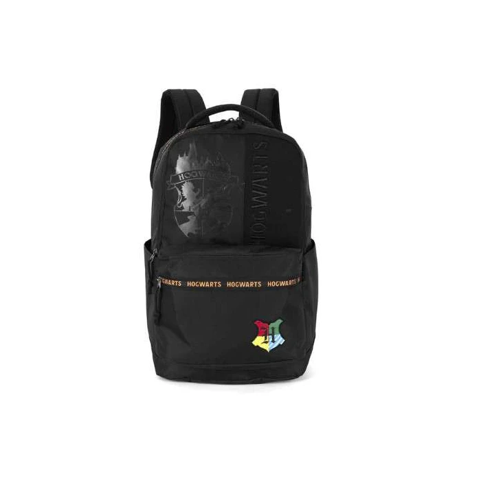 Mochila juvenil Harry Potter, composta de poliéster, possui um compartimento principal, compartimento interno para notebook, bolso frontal, bolso lateral, alças acolchoadas, alça de mão e logo estampado.