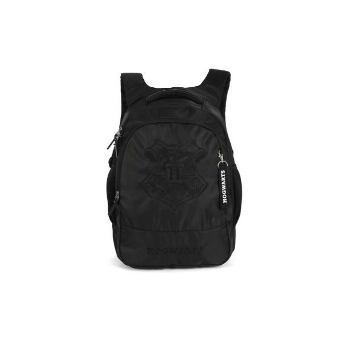 Mochila juvenil Harry Potter, composta de poliéster, possui um compartimento principal, bolso frontal, bolso lateral, alças acolchoadas, alça de mão e logo estampado.