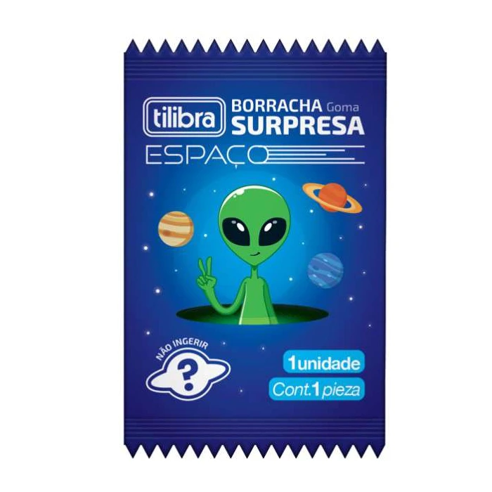 A Borracha Surpresa Espaço Tilibra é um produto divertido do início ao fim! Primeiro, você está envolto em um mistério espacial até abrir a embalagem. Como assim? Simples, o pacote é sortido e traz apenas a temática da borracha colorida, que é a espacial. Para saber qual o modelo, que pode ser no formato de extraterrestre, astronauta, foguete, nave, disco voador ou satélite, você precisará abrir!