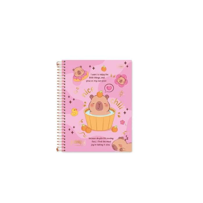 Estampa Capymoods Pampy com hot stamping dourado na capa dura: Visual moderno e encantador com acabamento sofisticado para proteger suas anotações.