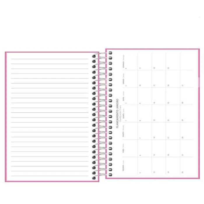 O modelo conta com visão de 1 dia por página, exceto aos sábados e domingos, permitindo anotações mais detalhadas e foco nas tarefas diárias. Possui planejamento mensal, facilitando a visualização geral dos compromissos e metas do mês.