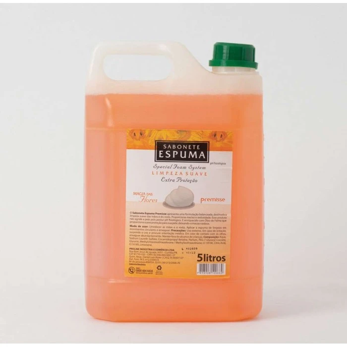 Frasco de sabonete espuma com 5 litros, para saboneteiras de parede com bomba. Fabricado por Premisse.Conteúdo: Sabonete espumaContém: 5 litrosFragrância: Magia das floresFabricante: Premisse